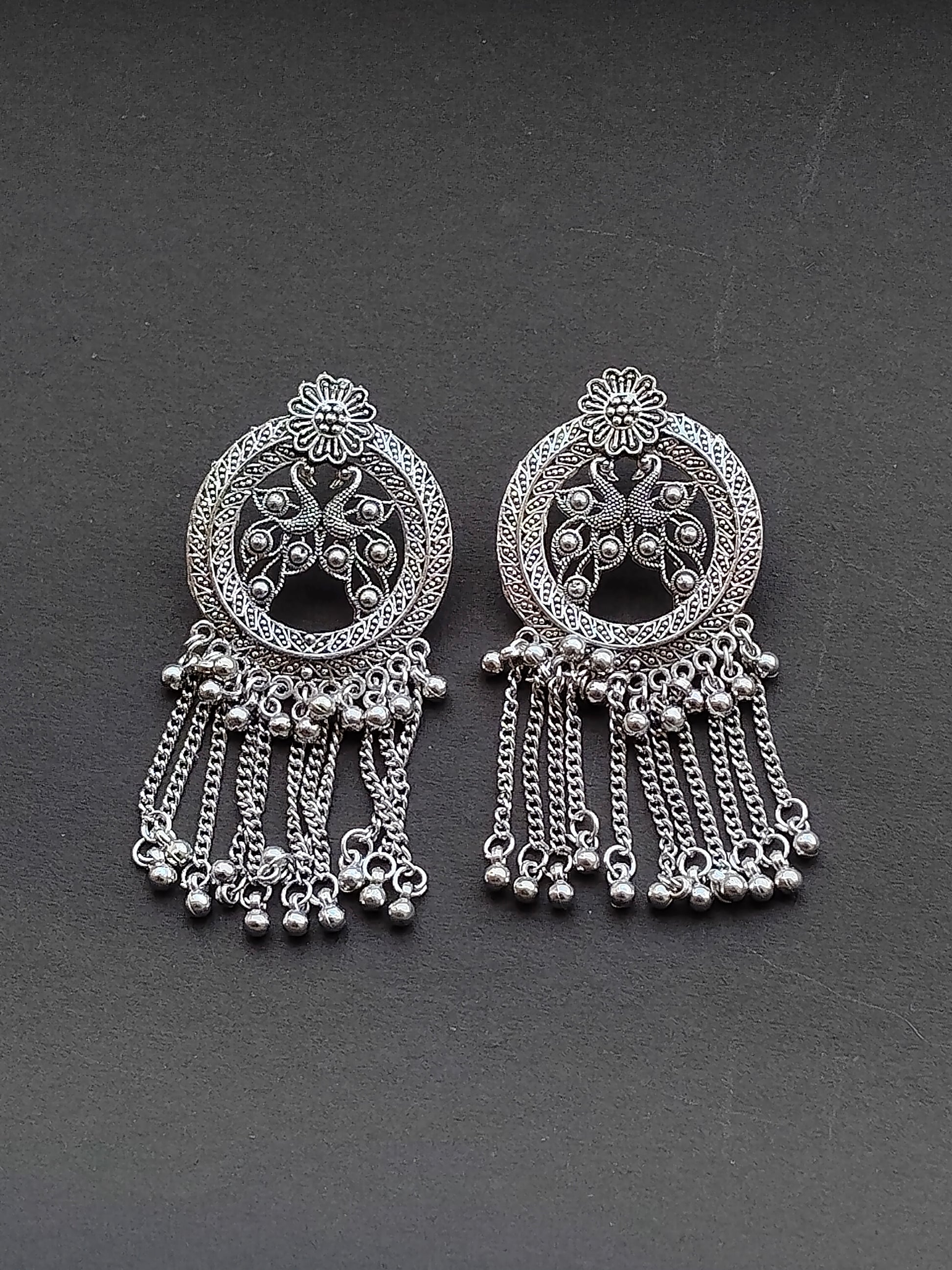 Make a statement with these striking Oxidized Silver Peacock Earrings! π¦ The intricate design features a beautiful peacock motif and dramatic cascading chains with tiny dangling ghungroos. Perfect for adding a bohemian or traditional touch to any outfit. π